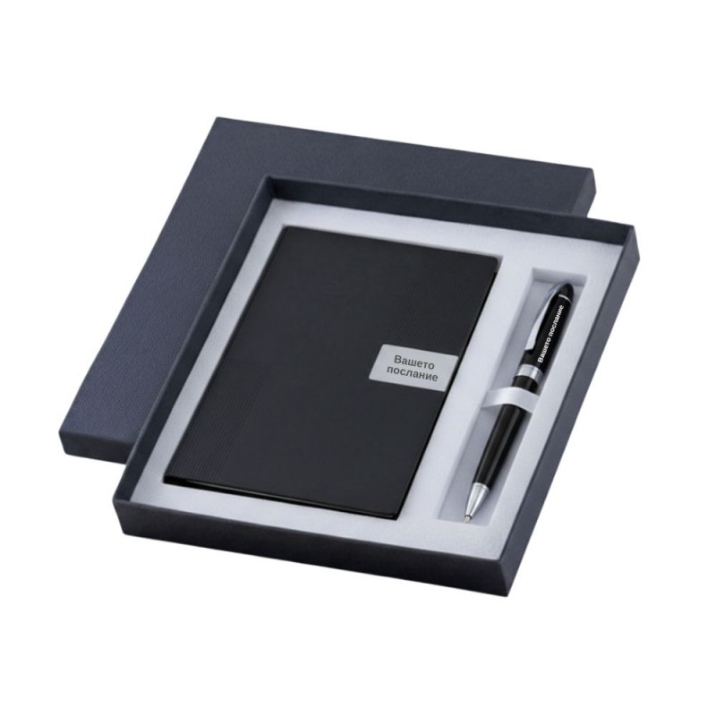 Гравиран Комплект черен тефтер и химикалка в кутия
