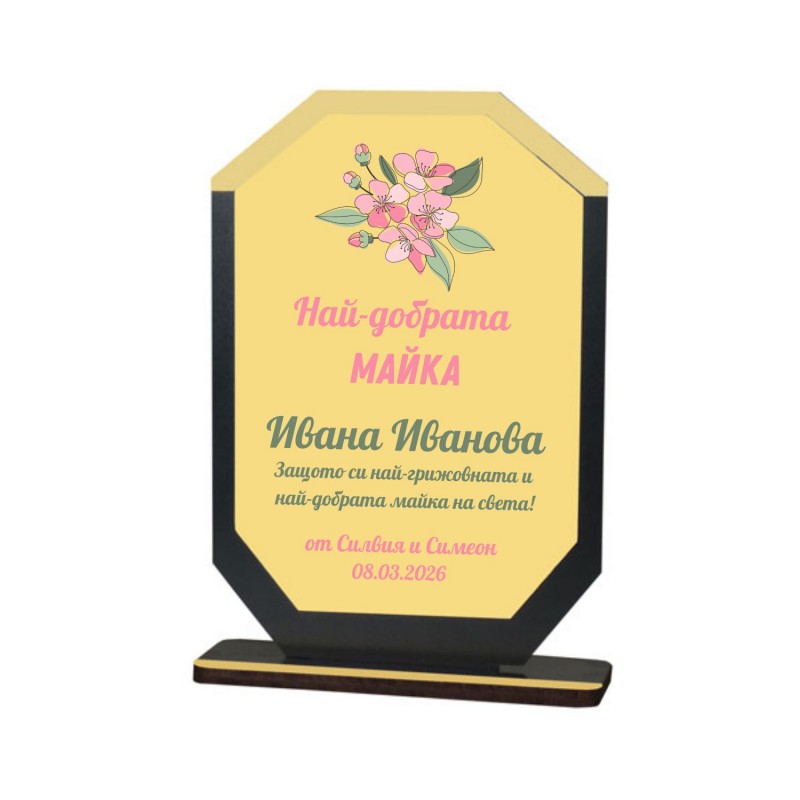 Персонализиран плакет със стойкаМатериал: дърво и метал;Размер на артикула: 15x20 см.Цвят на пл..