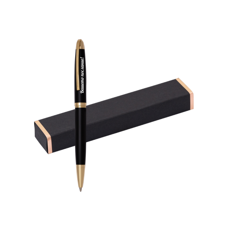 - Стилна метална черна химикалка, златисти елементи и въртящ механизъм.